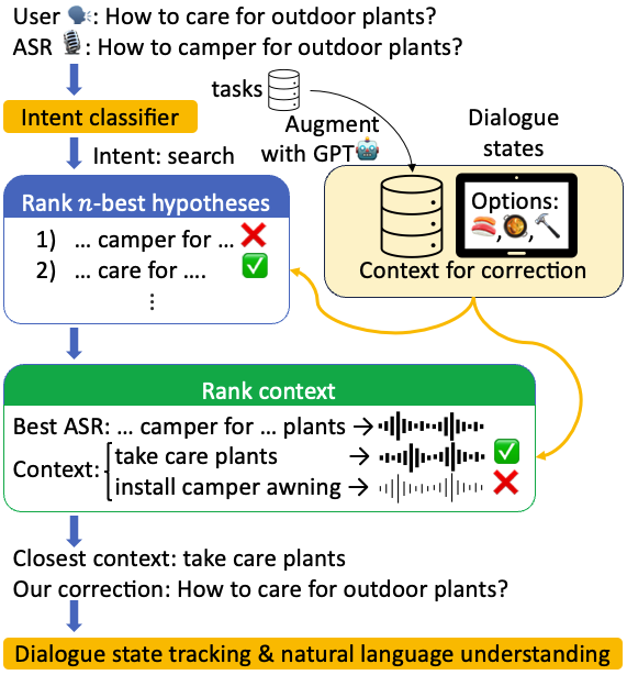Contextual ASR Error Handling with LLMs Augmentation for Goal-Oriented Conversational AI